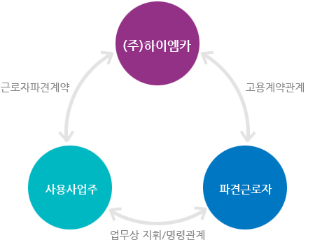 파견회사인 ㈜하이엠카의 직원이 파견의뢰 기업인 사용사업주 사업장에서, 사용사업주의 업무상 지휘를 받아 근로하며 ㈜하이엠카는 파견직원의 채용과 고용, 사후 관리를 책임집니다.